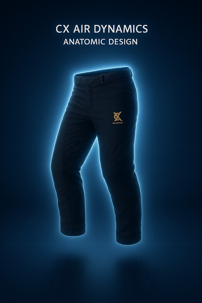 Le pantalon CX Air Dynamics, au design inspiré des combinaisons des pilotes de chasse, est doté d’un airbag créé sur mesure, pour protéger les zones les plus vulnérables des jambes : Hanches, Coccyx, Fémurs, Genoux, Tibias.